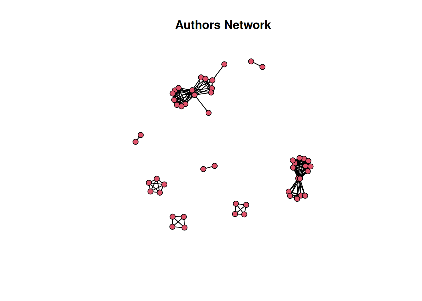 plot(g, vertex.color = color_palette[V(g)$sentiment], layout = layout_nicely, vertex.label = NA, vertex.size = 7, isolates=TRUE, main = "Authors Network by Sentiment")